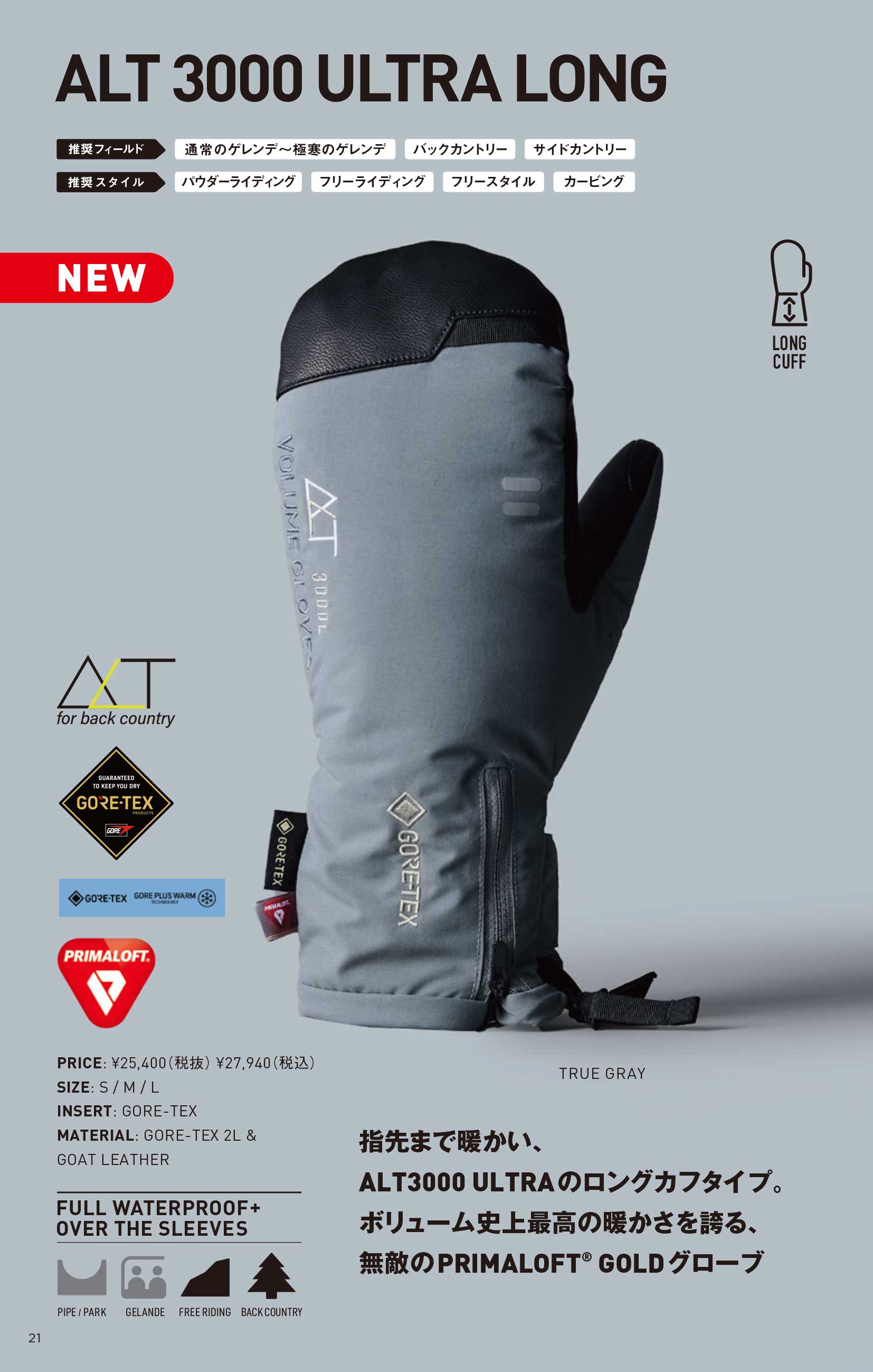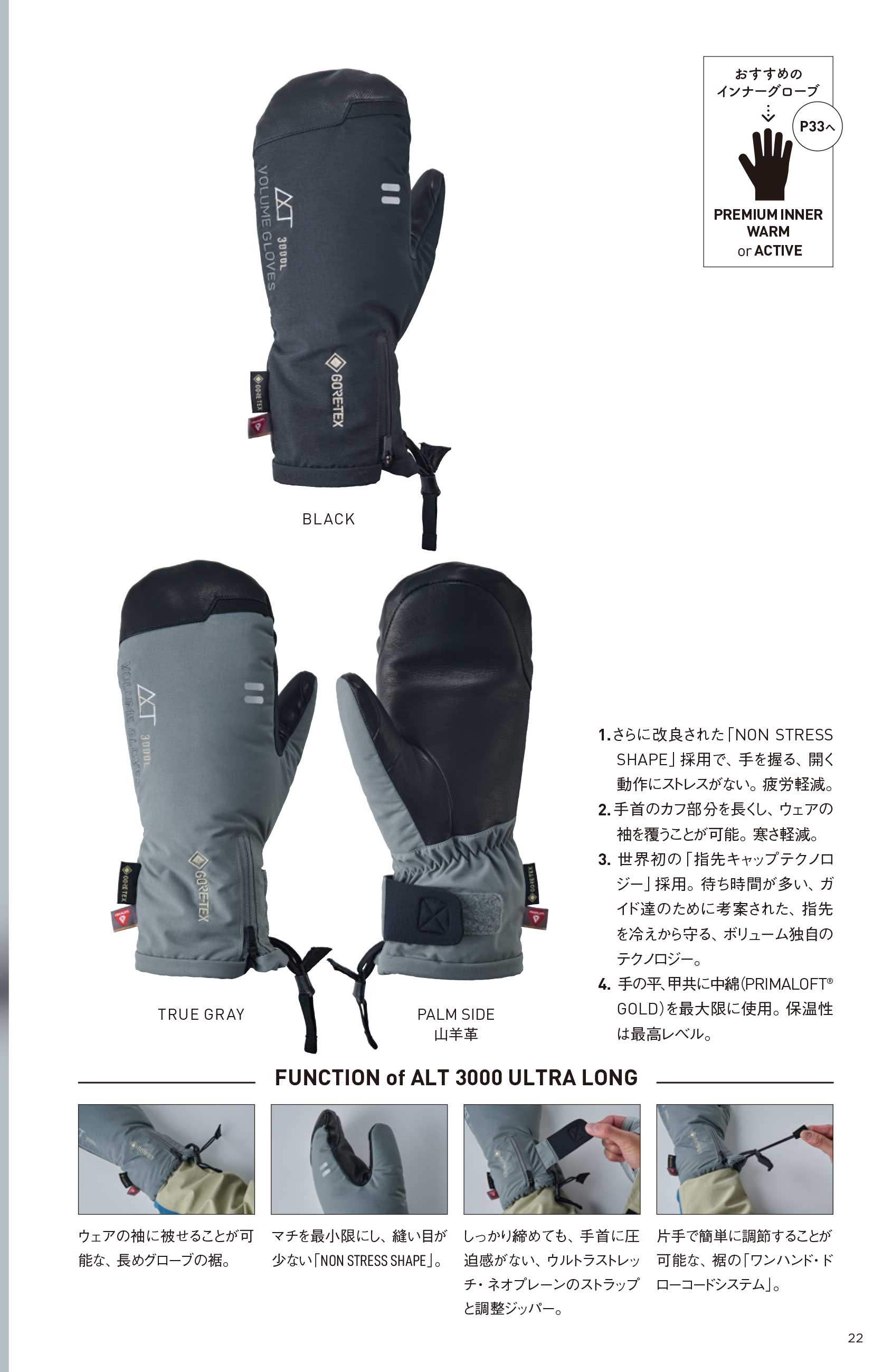 指先まで暖かい、 ALT3000 ULTRAのロングカフタイプ。 ボリューム史上最高の暖かさを誇る、 無敵のPRIMALOFT® GOLDグローブ