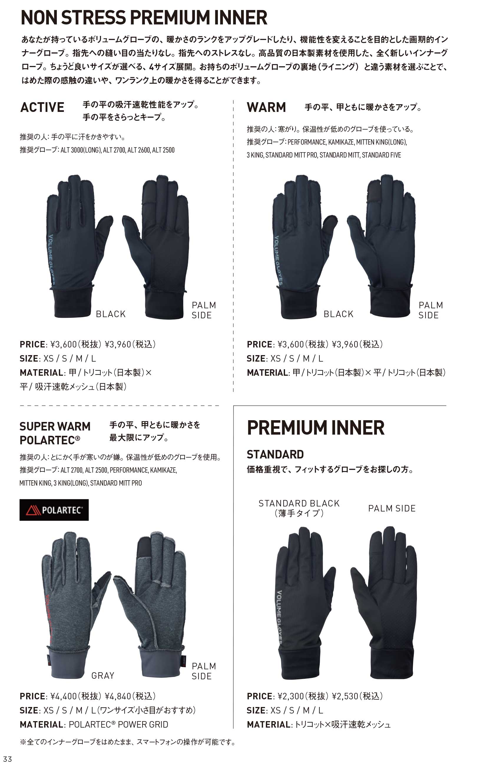 あなたが持っているボリュームグローブの、暖かさのランクをアップグレードしたり、機能性を変えることを目的とした画期的イン ナーグローブ。指先への縫い目の当たりなし。指先へのストレスなし。高品質の日本製素材を使用した、全く新しいインナーグ ローブ。ちょうど良いサイズが選べる、4サイズ展開。お持ちのボリュームグローブの裏地(ライニング)と違う素材を選ぶことで、 はめた際の感触の違いや、ワンランク上の暖かさを得ることができます。